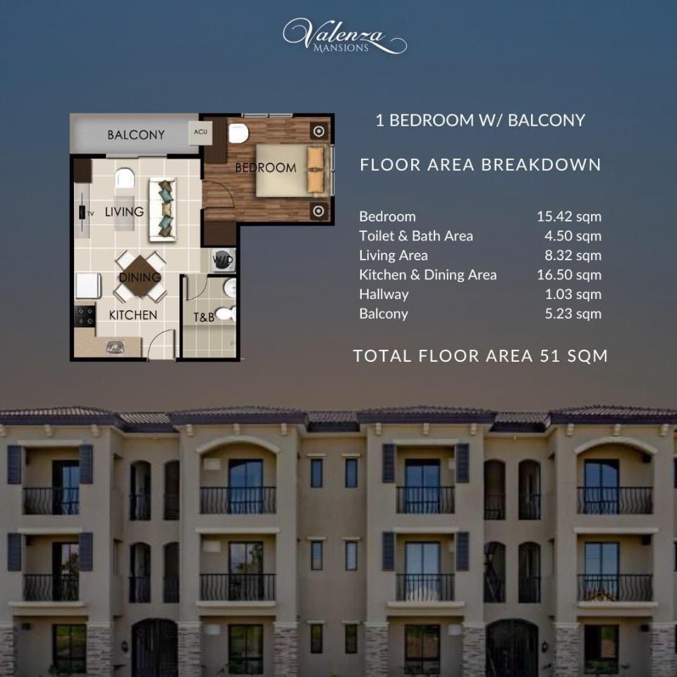 Located in Santa Rosa Laguna, Valenza Mansions features spacious 1-bedroom units. With a classic Italian design, there is an abundance of natural light and ventilation throughout the entire unit.
